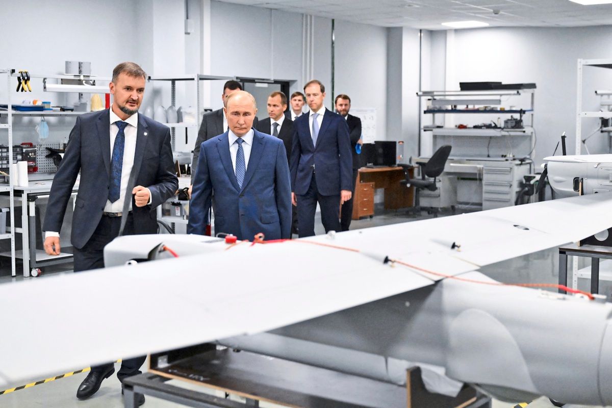 Wladimir Putin, als Kriegsverbrecher international gesucht, besucht eine Drohnenfabrik in St. Petersburg.